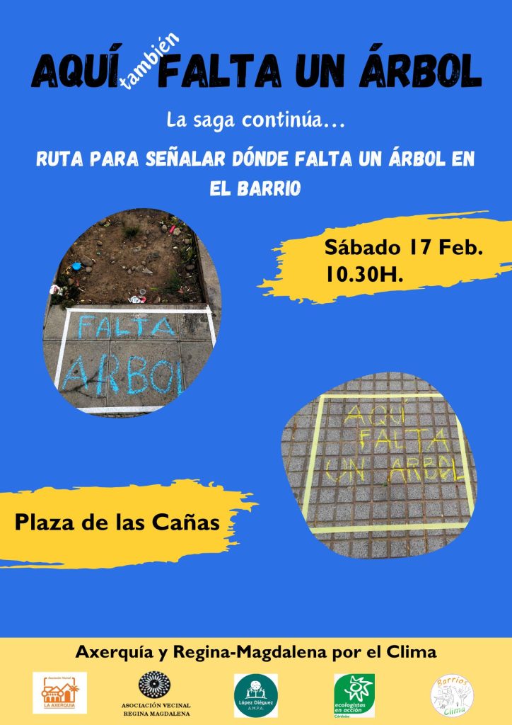 Las asociaciones vecinales de Axerquía y Regina-Magdalena, junto con Ecologistas en Acción, convocan una acción para “señalar alcorques vacíos, tocones cortados y lugares en los que, pese a disponer de espacio suficiente, carecen de arbolado.” La actividad comenzará el sábado 17 de febrero a las 10.30 de la mañana en la Plaza de las Cañas. Los medios podrán tomar imágenes a lo largo de la ruta por la plaza de la Compañía, calle Claudio Marcelo, Calle Diario Córdoba, el Compás de San Francisco, y paseo de la Ribera. O en la plaza de las Cañas, en la que serán atendidos a las 12.00 horas. Todas las personas y asociaciones de la ciudad están invitadas a participar.