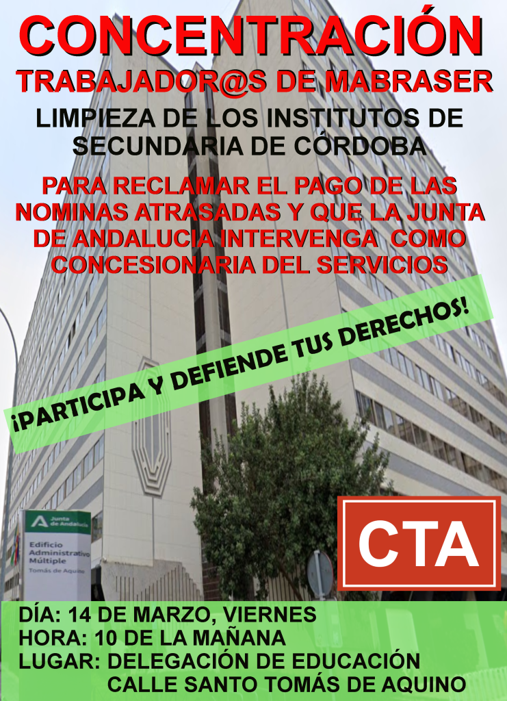 La Coordinadora de Trabajadores de Andalucía (CTA) ha denunciado ante la Inspección de Trabajo, además del impago de salarios, que la empresa Servicios y Mantenimiento Mabraser XI S.L., adjudicataria del servicio de limpieza de los institutos de secundaria dependientes de la Junta de Andalucía en la Delegación de Educación de Córdoba, desde el 1 de marzo, no responde a las llamadas de los trabajadores ni de este sindicato, no imparte órdenes, no suministra material de limpieza, no supervisa el trabajo ni mantiene ningún contacto con las trabajadoras.