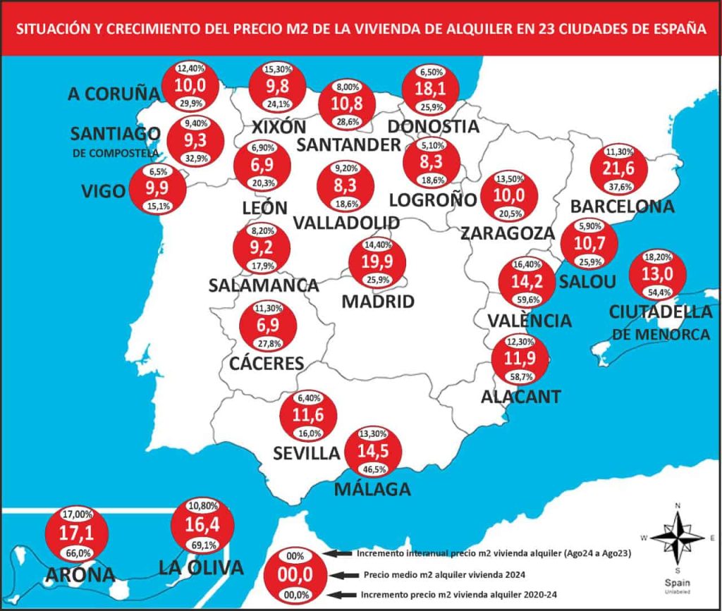 De las ciudades medianas más afectadas destacan Málaga, València y Alacant, con un índice de 30,3; 23,7 y 23,0 de VUT por cada 1.000 viviendas respectivamente, duplicando e incluso triplicando el índice promedio de Madrid capital. Se llega al extremo de que en barrios como el de Ciudad Jardín en Málaga un tercio de las viviendas son de uso turístico. Esta proliferación de las viviendas de uso turístico en estas tres ciudades tiene su reflejo en el precio de la vivienda de alquiler. Málaga es la ciudad mediana con más alto precio de vivienda alquiler, 14,50 €/m2, un precio que supera la media de las ciudades similares a ella (9 €/m2) y que se aproxima más al precio de las ciudades grandes y más caras, como Barcelona o Madrid. También sufre València este incremento en el precio de alquiler, con 14,2 €/m2 y Alacant, en menor medida, con 11,9 €/m2. Esta subida aún es mayor en los barrios más turistificados, así en el centro de Málaga hay un encarecimiento del 7,9 % de la vivienda respecto a la media del municipio. Un 25,2 % para Ciutat Vella en València y hasta un 16,7 % para la Albufereta en Alacant.