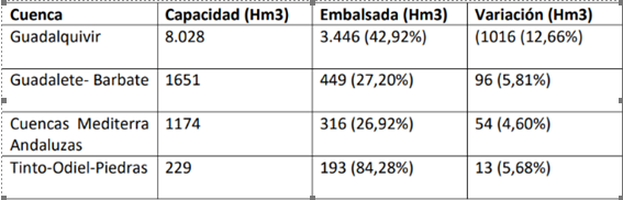 En el caso de la Demarcación del Guadalquivir, las lluvias de la última semana han posibilitado un fuerte ascenso respecto al agua embalsada, pero Ecologistas en Acción llama a la prudencia, que «debe ser la norma que impere en la gestión del recurso de cara a la próxima comisión de desembalse. No olvidemos que ya hay sectores productivos, como el sector arrocero y los grandes regantes, que reclaman aumento del agua disponible e incluso hablan de que podría haber cosechas casi normales. A pesar de que la cuenca se encuentra actualmente cerca del 43% de agua embalsada, lo que supone 17 puntos mejor que hace un año, no hay que perder la perspectiva de que seguimos estando 13 puntos por debajo de la media de los últimos 10 años«.