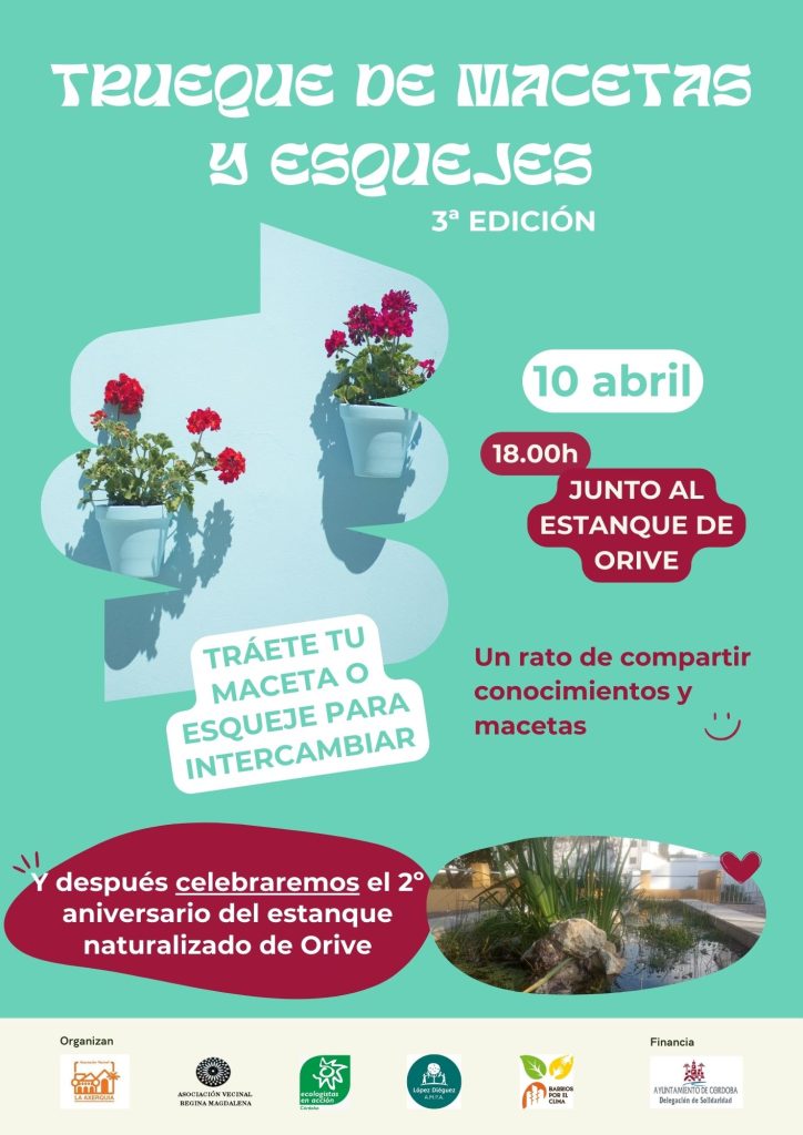 “Este año, los días sábado 12 y lunes 14 están muy condicionados por la celebración de la Semana Santa, por lo que hemos acordado hacer esta celebración el jueves día 10”, informan las organizaciones convocantes que añaden “además de cantar el cumpleaños feliz al estanque, hemos programado el tercer trueque de macetas, actividad en la que contamos con la colaboración del Jardín Botánico de Córdoba”.