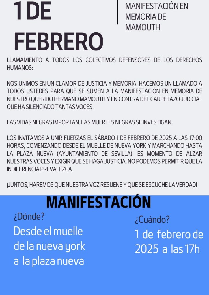Por todo ello, el próximo sábado 1 de febrero a las 17 horas, la Federación convoca una manifestación que iniciará su recorrido en el Muelle de Nueva York, donde se acabó con la vida de Mamouth, para mantener en la memoria colectiva a su compañero y para exigir la continuación de la investigación judicial y un cambio radical en las políticas municipales sobre la venta ambulante y la inclusión de las personas inmigrantes vecinas de Sevilla.