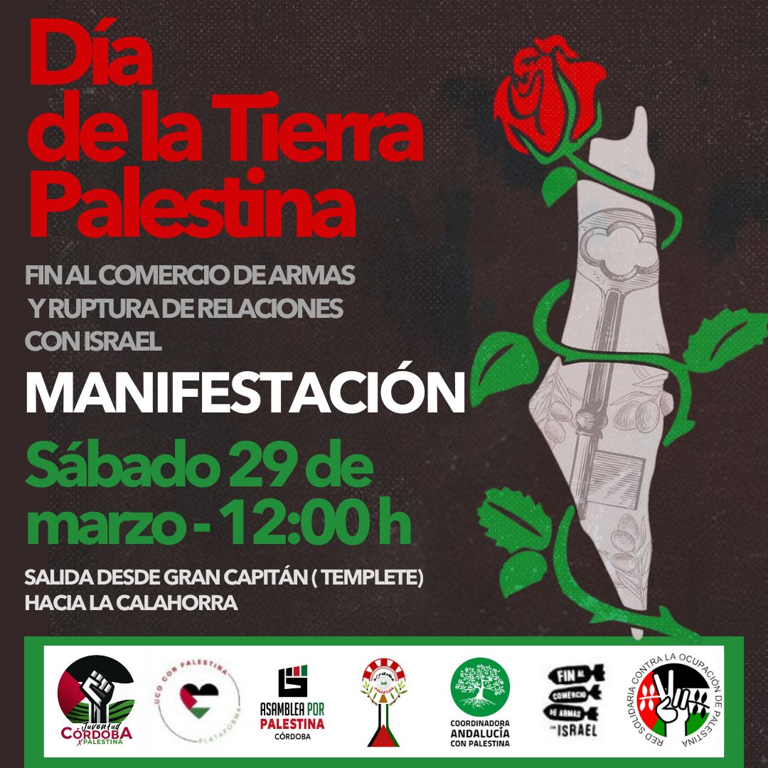 Esta convocatoria responde a un llamamiento a nivel estatal promovido por la Red Solidaria contra la Ocupación de Palestina, RESCOP, el movimiento que agrupa a decenas de organizaciones en todo el estado español y coincide con la celebración del Día de la Tierra Palestina el domingo día 30 de marzo, fecha en la que se conmemora la huelga general y las manifestaciones celebradas en las ciudades de mayoría palestina en Israel el año 1976 en respuesta al anuncio del gobierno israelí de un plan para expropiar gran cantidad de tierra de propiedad palestina para dedicarla a nuevos asentamientos judíos.
