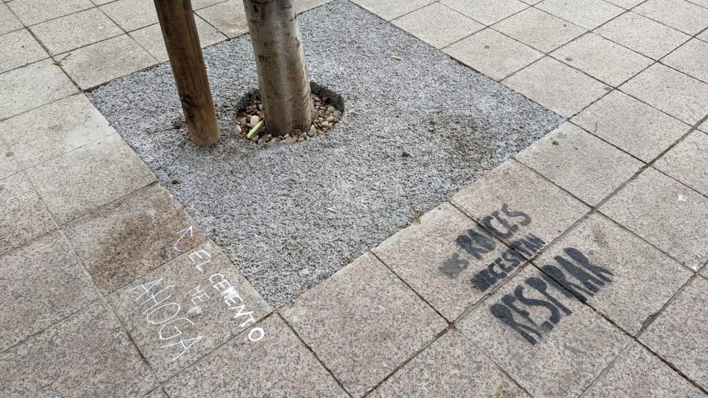 Ecologistas en Acción ha notificado en nota de prensa que ha tenido conocimiento de acciones de vecinas y vecinos de la ciudad junto a alcorques pavimentados exigiendo que se revierta esta intervención. Estas personas portaban pancartas con lemas como “Libérame, me asfixio”, “Mis raíces necesitan respirar” o “Más árboles, más frescor”.